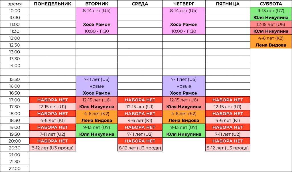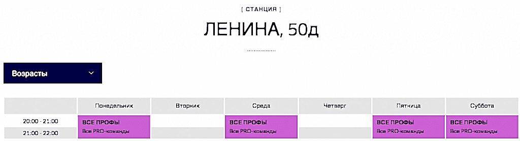 | 20:00 - 21:00 | ВСЕ ПРОФЫ Все PRO-команды ВСЕ ПРОФЫСовместная тренировка проф. Pin-Up в "Станции". | ВСЕ ПРОФЫ Все PRO-команды ВСЕ ПРОФЫСовместная тренировка проф. комманд в Pin-Up | ВСЕ ПРОФЫ Все PRO-команды ВСЕ ПРОФЫСовместная тренировка проф. Pin-Up в "Станции". | |||